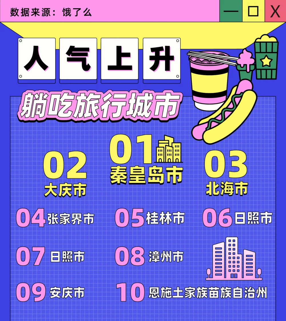 从外卖地点的变化来看,五一期间,最爱去三、四线等郊区乡村旅游的游客多来自周边城市。以漳州为例,游客多来自厦门、福州等省内城市;而在网红景点阿那亚,来自北京、天津、哈尔滨的游客远超过了省会石家庄本地。对这届小镇青年来说,北京、长沙、上海、合肥和南京是这个五一他们偏好前往“躺吃”的旅行城市。