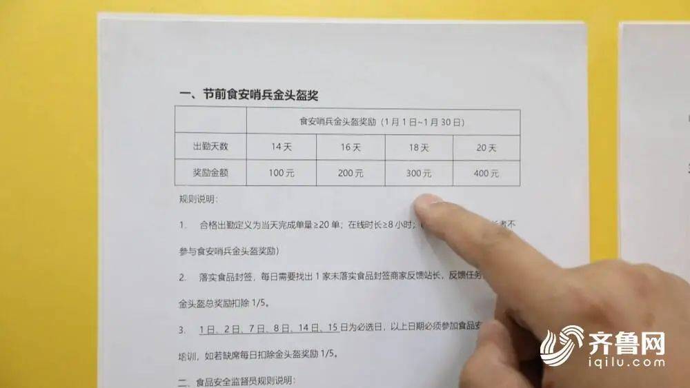 为了使外卖骑手监督执法规范有效,市场监管部门对他们进行了培训,网络餐饮平台也制定了更为详细的激励措施。 “我们分两个策略,第一个是出勤天数最低14天,我们有一百块钱奖励,20天以上最高的就是四百块钱。第二个根据食安这边的贡献,比如说他发现的没有双证,这样有不同的积分,根据积分的多少有不同的奖励。”美团外卖禹城站负责人路兵告诉闪电新闻记者。