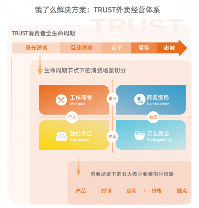 与此同时,TRUST模型也结合了事业、休闲、个人和社交四大场景象限,以及产品、时间、空间、价格、触点五大要素,可以更好帮助餐饮品牌看清消费需求的变化。