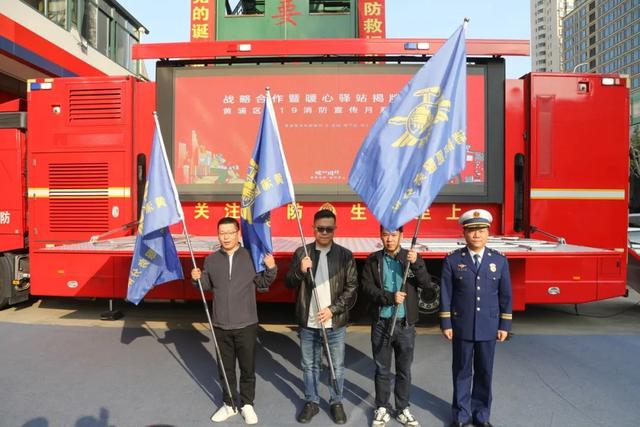 仪式上,黄浦区消防救援局党委书记、政治委员王明华为美团、饿了么、顺丰三家企业志愿服务分队授旗。